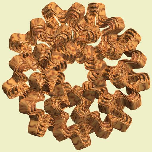 | Keywords: mathematica 3d cg parametricplot3d texture torus code program algorithm プログラム コード アルゴリズム 輪環 りんかん ドーナツ どーなつ トーラス とーらす geometric sculpture geometricsculpture shape geometry sculpture mapping テクスチャ マッピング 模様 もよう design pattern デザイン パターン graphic グラフィック グラフィクス structure 意匠 構造 symmetry 対称性 たいしょうせい シンメトリー 対称 たいしょう white background food indoor foliage leaf plant a = 4; (* center hole size of a torus *) b1 = 6;(* number of angle *) b2 = 4;(* number of wave *) c = 6; (* distance from the center of rotation *) d = 9; (* number of torus *) SetOptions[ParametricPlot3D, PlotRange -> Full, Mesh -> None, Boxed -> False, Axes -> None, PlotPoints -> 500, ImageSize -> 3000, Background -> RGBColor[{240, 240, 200}/255], PlotStyle -> Directive[Specularity[White, 70], Texture[Import["D:/tmp/96.jpg"]]], TextureCoordinateFunction -> ({#4, #5 Pi} &), Lighting -> "Neutral"]; f[v_] := Sin[2 Sin[Sin[Sin[v]]]]; x = (a - Cos[t] + f[b1 s]) Cos[s] + c; y = (a - Cos[t] + f[b1 s]) Sin[s] + c; z = f[b2 t]; rm = Table[{x, y, z}.RotationMatrix[2 i Pi/d, {1, 0, 1}], {i, d}]; ParametricPlot3D[rm, {t, 0, 2 Pi}, {s, 0, 2 Pi}] (*--- The Texture *) a = 4; (* center hole size of a torus *) b1 = 6;(* number of angle *) b2 = 4;(* number of wave *) c = 6; (* distance from the center of rotation *) d = 9; (* number of torus *) SetOptions[ParametricPlot3D, PlotRange -> Full, Mesh -> None, Boxed -> False, Axes -> None, PlotPoints -> 500, ImageSize -> 3000, Background -> RGBColor[{240, 240, 200}/255], PlotStyle -> Directive[Specularity[White, 70], Texture[Import["D:/tmp/96.jpg"]]], TextureCoordinateFunction -> ({#4, #5 Pi} &), Lighting -> "Neutral"]; f[v_] := Sin[2 Sin[Sin[Sin[v]]]]; x = (a - Cos[t] + f[b1 s]) Cos[s] + c; y = (a - Cos[t] + f[b1 s]) Sin[s] + c; z = f[b2 t]; rm = Table[{x, y, z}.RotationMatrix[2 i Pi/d, {1, 0, 1}], {i, d}]; ParametricPlot3D[rm, {t, 0, 2 Pi}, {s, 0, 2 Pi}] (*--- The Texture *) |