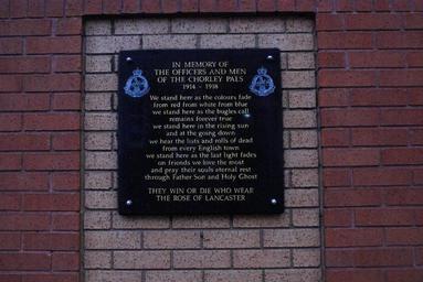 | Keywords: chorley lancashire chorleylancashire chorley 2015 chorley2015 365 remembrance chorley pals chorleypals memorial union street unionstreet booth's supermarket boothssupermarket text brick architecture writing sign street sign The plaque was placed here on the wall of Booth's supermarket by the Royal British Legion.  Close to here on the cattle market is the is where, on 26th January 1915 the Chorley Pals were inspected by Brigadier-General G.M. McKenzie before leaving for additional training, deployment in Egypt and eventually to the Somme.      The plaque was placed here on the wall of Booth's supermarket by the Royal British Legion.  Close to here on the cattle market is the is where, on 26th January 1915 the Chorley Pals were inspected by Brigadier-General G.M. McKenzie before leaving for additional training, deployment in Egypt and eventually to the Somme.       |