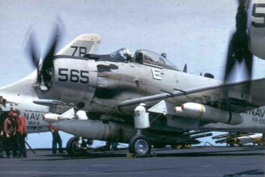 Keywords: A-1H VA-215 CVA-31 1967.jpg A Douglas A-1H Skyraider of attack squadron VA-215 Barn Owls Attack Carrier Air Wing 21 CVW-21 armed with rocket launchers aboard the aircraft carrier USS Bon Homme Richard CVA-31 in 1967 The Bonnie Dick was on a deployment to Vietnam from 26 Jan 1967 to 25 Aug 1967 The tail of a Douglas KA-3B Skywarrior of heavy attack squadron VAH-4 Fourrunners is visible in the background U S Navy sailor or employee http //groups msn com/VF154PhotoGallery/miscaircraft msnw action ShowPhoto PhotoID 135 1967 author AD-6 A-1H Skyraider Aboard USS Bon Homme Richard CV-31 Attack Squadron 215 United States Navy PD-USGov-Military-Navy |