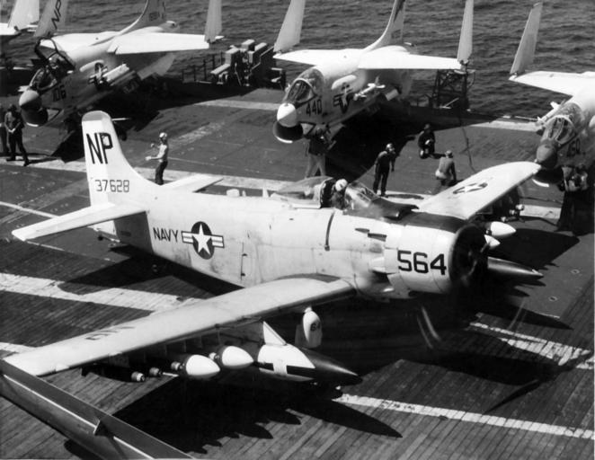 Keywords: A-1H VA-215 armed for strike CVA-19 1965.jpeg A U S Navy Douglas A-1H Skyraider BuNo 137628 from Attack Squadron VA-215 Barn Owls ready for launching aboard the aircraft carrier USS Hancock CVA-19 in 1965 IN the background are a Vought F-8C Crusader NP-440 BuNo 147008 from Fighter Squadron VF-24 Red Checkertails and an F-8E from VF-211 Checkmates NP-106 BuNo 150914 The aircraft were assigned to Attack Carrier Air Wing 21 CVW-21 for a deployment to Vietnam from 21 October 1964 to 29 May 1965 <br> The photo was taken during attacks by the carriers of Task Force 77 USS Ranger CVA-61 USS Coral Sea CVA-43 and USS Hancock CVA-19 which conducted air strikes against North Vietnamese bases utilized as training and staging bases for the infiltration of South Vietnam on 7 and 11 Feb 1965 and on 16 and 19 Mar 1965 http //collections naval aviation museum/emuwebdoncoms/pages/doncoms/Query php U S Navy National Museum of Naval Aviation photo No http //collections naval aviation museum/emuwebdoncoms/pages/doncoms/Display php irn 16002256 QueryPage 2Femuwebdoncoms 2Fpages 2Fdoncoms 2FAdvQuery php 1996 253 2981 1965 U S Navy PD-USGov-Military-Navy Aboard USS Hancock CV-19 AD-6 A-1H Skyraider Attack Squadron 215 United States Navy F-8C Crusader Fighter Squadron 24 United States Navy Fighter Squadron 211 United States Navy United States Navy in the Vietnam War |