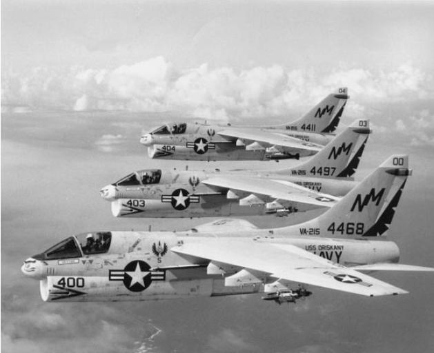 Keywords: A-7B VA215 CVA-34.jpg Three Vought A-7B Corsair II BuNos 154411 154468 and 154497 from attack squadron VA-215 Barn Owls Attack Carrier Air Wing Nineteen CVW-19 in 1972 VA-215 was deployed aboard the aircraft carrier USS Oriskany CVA-34 from 1971 to 1976 U S Naval History Center Dictionary of American Naval Aviation Squadrons Volume 1 The History of VA VAH VAK VAL VAP and VFA Squadrons Chapter 2 Attack Squadron Histories for VA-210 to VA-873 p 284 http //www history navy mil/download/va210873 pdf; http //collections naval aviation museum/emuwebdoncoms/pages/doncoms/AdvQuery php U S Navy National Museum of Naval Aviation photo No http //collections naval aviation museum/emuwebdoncoms/pages/doncoms/Display php irn 12609 QueryPage 2Femuwebdoncoms 2Fpages 2Fdoncoms 2FAdvQuery php 1996 253 7110 020 1972 USN PD-USGov-Military-Navy A-7B Corsair II Attack Squadron 215 United States Navy 1972 in aviation |