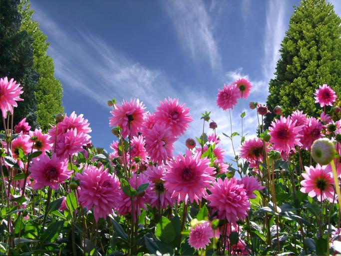 Keywords: a beautiful day good mood joy dahlias flowers window summer midsummer late summer summer flowers sky blue red flowers a garden park outlook south park düsseldorf colorful horticulture germany
