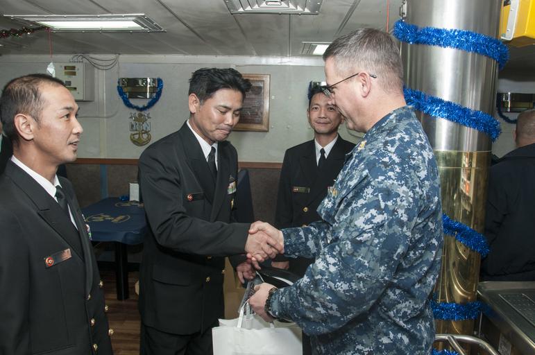 | Keywords: A bilateral gift exchange 151218-N-RU971-392.jpg en 151218-N-RU971-392 SASEBO Japan Dec 18 2015 Japan Maritime Self Defense Force JMSDF Chief Ryuichi Rokutanzono from Shirane-class destroyer JDS Kurama DDH 144 trades coins with Master Chief Aviation Boatswain s Mate Frank Bartanowitz in the chief s mess aboard the forward-deployed amphibious assault ship USS Bonhomme Richard LHD 6 Bonhomme Richard is the lead ship of the Bonhomme Richard Amphibious Ready Group and is forward-deployed to Sasebo Japan in the U S 7th Fleet area of operations U S Navy Photo by Mass Communication Specialist 3rd Class Cameron McCulloch/Released <br>Unit USS Bonhomme Richard LHD 6 2015-12-18 Petty Officer 3rd Class Cameron McCulloch https //www dvidshub net/image/2341340/bilateral-gift-exchange 151218-N-RU971-392 2015-12-21 23 45 SASEBO NAGASAKI JP PD-USGov-Military-Navy JS Kurama DDH-144 USS Bonhomme Richard LHD-6 Images from DoD uploaded by FĂŚ |