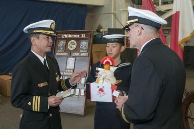 | Keywords: A bilateral gift exchange 151218-N-RU971-629.jpg en 151218-N-RU971-629 SASEBO Japan Dec 18 2015 Cmdr Shin Makino Japan Maritime Self Defense Force JMSDF Shirane-class destroyer JDS Kurama DDH 144 executive officer explains the significant of a traditional rice cake to Cmdr Kirk Knox forward-deployed amphibious assault ship USS Bonhomme Richard LHD 6 operations officer on the quarterdeck aboard Bonhomme Richard Bonhomme Richard is the lead ship of the Bonhomme Richard Amphibious Ready Group and is forward-deployed to Sasebo Japan in the U S 7th Fleet area of operations U S Navy photo by Mass Communication Specialist 3rd Class Cameron McCulloch/Released <br>Unit USS Bonhomme Richard LHD 6 2015-12-18 Petty Officer 3rd Class Cameron McCulloch https //www dvidshub net/image/2341350/bilateral-gift-exchange 151218-N-RU971-629 2015-12-21 23 43 SASEBO NAGASAKI JP PD-USGov-Military-Navy JS Kurama DDH-144 USS Bonhomme Richard LHD-6 Images from DoD uploaded by FĂŚ |
