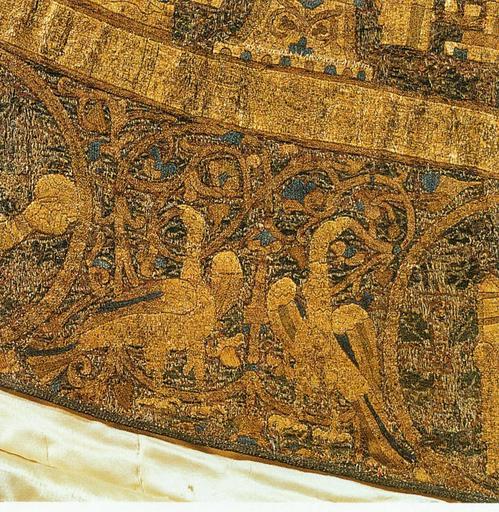 | Keywords: A bird-couple on the edge of the coronation pall.jpg author 1031 textile embroidery Institution Hungarian National Museum Budapest object history credit line accession number own scanned by Szilas from A magyar Szent Korona by Tóth Endre Szelényi Károly Kossuth 2000 Budapest PD-old-100 Coronation pall of Hungary |