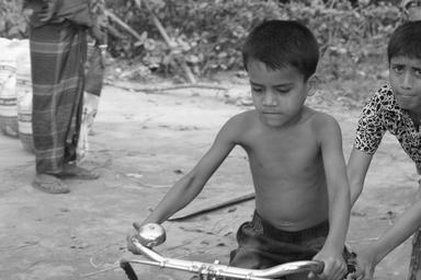 Keywords: a boy try to learn cycle on the road capture this photo by other side