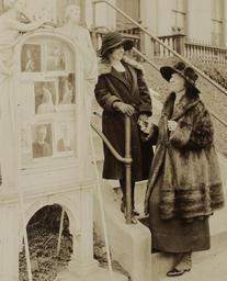 | Keywords: A breathing spell between campaigns 152006v (1).jpg A breathing spell between campaigns - Miss Anita Pollitzer left and Miss Elsie Hill secretary and chairman respectively of the Woman's Party meet on the steps of the Party headquarters The Bulletin Board in the picture saw the stormiest days of the suffrage campaign and still tells of the Party's activities on behalf of women Harris Ewing Photographer ca 1922-1925 Summary Anita Pollitzer left wearing wide-brimmed floppy hat gloves and fur-trimmed coat standing on outside steps near stone bulletin board displaying photographs at the National Woman's Party headquarters and holding railing with right hand and clasping in her left hand the right hand of Elsie M Hill who is wearing a wide-brimmed hat fur coat and long dress Title and name and address of photographer transcribed from image 1 photograph print; 4 x 6 in accession number Call Number Location National Woman's Party Records Group I Container I 152 Folder Hill Elsie M Source Collection Records of the National Woman's Party institution Library of Congress Manuscript Division http //hdl loc gov/loc mss/mnwp 152006 <gallery>A breathing spell between campaigns 152006v jpg</gallery> PD-Harris-Ewing suffragettes Suffragettes wearing fur Letting out fur Women wearing coats 1920s Anita Pollitzer Fur fashion in 1923 |