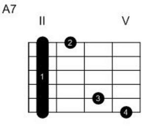 Keywords: A-Dur-7 Barré.jpg Eigenanfertigung 2005-12-01 own assumed Red Rooster Guitar chords in standard tuning
