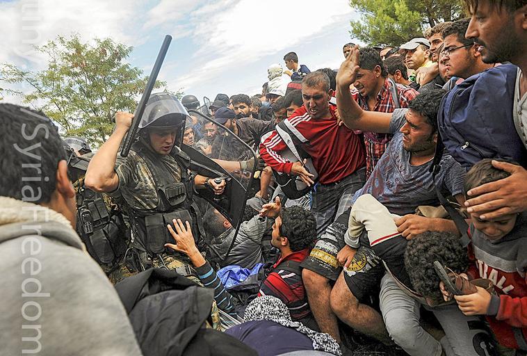 Keywords: :rel:d🇧🇲gf10000179559 reldgf10000179559 angela merkel angelamerkel assad crimes assadcrimes aylankurdi camps crimes against humanity crimesagainsthumanity death death journey deathjourney eu hungary misery refugees syria أوروبا أيلان كردي أيلانكردي أيلان كوردي أيلانكوردي جرائم الأسد جرائمالأسد رحلة الموت رحلةالموت سوريا غرق لاجئين مأساة هنغاريا outdoor A Macedonian police officer raises his baton toward migrants to stop them from entering into Macedonia at Greece's border, near the village of Idomeni, Greece, Aug. 22, 2015. A Macedonian police officer raises his baton toward migrants to stop them from entering into Macedonia at Greece's border, near the village of Idomeni, Greece, Aug. 22, 2015.