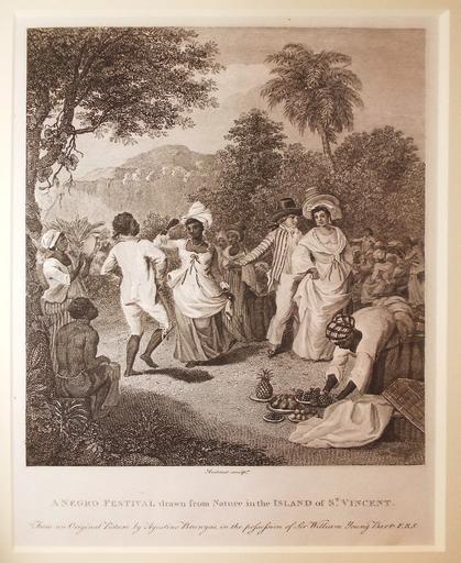 | Keywords: A Negro Festival drawn from Nature in the Island of St Vincent.JPG en Engraving 'after Agostino Brunias' ca 1801 and formerly attributed to him entitled A Negro Festival drawn from Nature in the Island of St Vincent Engraved by Audinet The work depicts apparently happy slaves dancing in fine clothes in a clearing with a spread of exotic fruits from a large wicker hamper In collection of National Maritime Museum Greenwich 1801 own photo of engraving in National Maritime Museum Greenwich after Agostino Brunias PD-old-100 Uploaded with UploadWizard Agostino Brunias Engravings after Agostino Brunias 1801 engravings History of slavery History of Saint Vincent and the Grenadines |