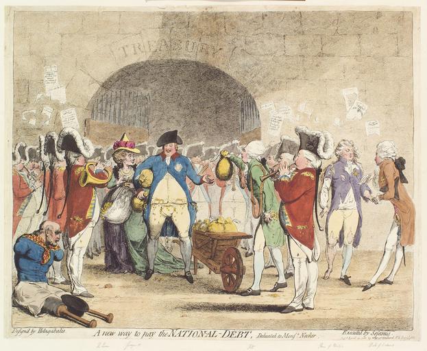 | Keywords: A new way to pay the National-Debt by James Gillray.jpg A new way to pay the national-debt / design'd by Helagabalis ; executed by Sejanus SUMMARY Cartoon shows King George III and Queen Charlotte standing before the Treasury moneybags under their arms their pockets overflowing and bursting with coins funds from the Treasury to cover Royal debts William Pitt his pockets full of coins hands the king another moneybag taken from an overflowing wheelbarrow; the Prince of Wales George IV stands to the right looking destitute; a quadriplegic sits on the ground to the left with an overturned and empty hat between the stubs of his legs which are fitted with prostheses MEDIUM 1 print etching CREATED/PUBLISHED London Pubd by Willm Holland 1786 April 21 D13052 1786-04-21 creator James Gillray No known restriction on publication File National-Debt-Gillray jpeg PD-old-100 National Portrait Gallery London James Gillray Caricatures of George III of the United Kingdom 1786 cartoons Caricatures of the United Kingdom Government debt 18th-century etchings Tricorne hats in art Wheelbarrows in art 1786 in Great Britain Moneybags Queues hair fashion |
