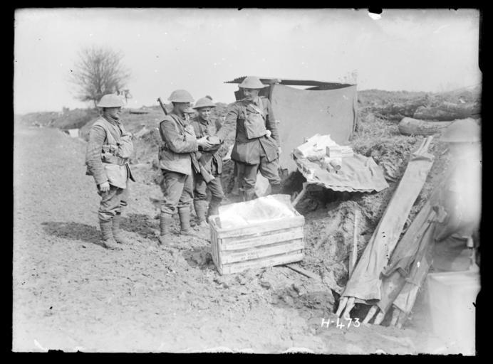 Keywords: blackandwhite monochrome photo border outdoor black and white The Padre of the New Zealand Rifle Brigade operating a makeshift wayside canteen for soldiers in the front line. Shows him handing a cake to a soldier. Stretchers are prominent in the right foreground. Photograph taken La Signy Farm 6 April 1918 by Henry Armytage Sanders. Inscriptions: Inscribed - Photographer's title on negative -bottom right: H473. Quantity: 1 b&w original negative(s). Physical Description: Dry plate glass negative 4.75 x 6.5 inches A New Zealand padre with his wayside canteen on the Western Front. Royal New Zealand Returned and Services' Association :New Zealand official negatives, World War 1914-1918. Ref: 1/2-013091-G. Alexander Turnbull Library, Wellington, New Zealand. natlib.govt.nz/records/23076881 The Padre of the New Zealand Rifle Brigade operating a makeshift wayside canteen for soldiers in the front line. Shows him handing a cake to a soldier. Stretchers are prominent in the right foreground. Photograph taken La Signy Farm 6 April 1918 by Henry Armytage Sanders. Inscriptions: Inscribed - Photographer's title on negative -bottom right: H473. Quantity: 1 b&w original negative(s). Physical Description: Dry plate glass negative 4.75 x 6.5 inches A New Zealand padre with his wayside canteen on the Western Front. Royal New Zealand Returned and Services' Association :New Zealand official negatives, World War 1914-1918. Ref: 1/2-013091-G. Alexander Turnbull Library, Wellington, New Zealand. natlib.govt.nz/records/23076881 |