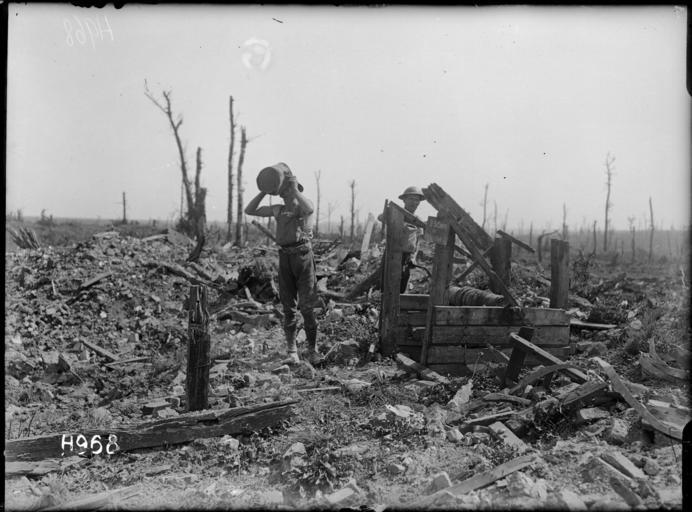| Keywords: blackandwhite monochrome outdoor photo border black and white A New Zealand soldier drinking from a bucket of well water in the ruins of the French village of Puisieux. Another soldier looks on. Apart from the well which remains functioning, everything else has been destroyed. Photograph taken late August 1918 by Henry Armytage Sanders. Inscriptions: Inscribed - Photographer's title on negative -bottom left: H968. Quantity: 1 b&w original negative(s). Physical Description: Dry plate glass negative 4 x 5 inches    A New Zealand soldier drinks from a well in ruined Puisieux, World War I. Royal New Zealand Returned and Services' Association :New Zealand official negatives, World War 1914-1918. Ref: 1/2-013537-G. Alexander Turnbull Library, Wellington, New Zealand. natlib.govt.nz/records/22806795 A New Zealand soldier drinking from a bucket of well water in the ruins of the French village of Puisieux. Another soldier looks on. Apart from the well which remains functioning, everything else has been destroyed. Photograph taken late August 1918 by Henry Armytage Sanders. Inscriptions: Inscribed - Photographer's title on negative -bottom left: H968. Quantity: 1 b&w original negative(s). Physical Description: Dry plate glass negative 4 x 5 inches    A New Zealand soldier drinks from a well in ruined Puisieux, World War I. Royal New Zealand Returned and Services' Association :New Zealand official negatives, World War 1914-1918. Ref: 1/2-013537-G. Alexander Turnbull Library, Wellington, New Zealand. natlib.govt.nz/records/22806795  |
