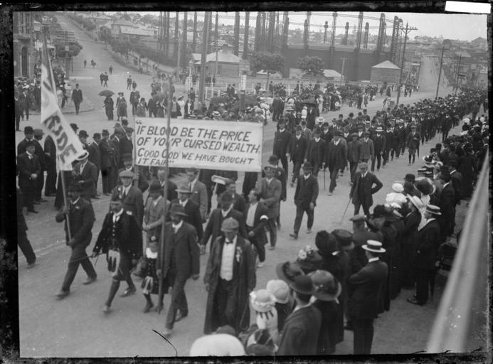 Keywords: gefreenz auckland no tpp notpp 1913-2016 19132016 blackandwhite monochrome black and white Shows a group of protesters marching in the vicinity of the gasometer, College Hill, and Victoria Street, Auckland during the 1913 Waterfront Strike. A crowd of spectators stand on the side-walk. One of the banners has the quote "If blood be the price of your cursed wealth, good God we have bought it fair". Photograph taken by William A Price in Nov 1913. Quantity: 1 b&w original negative(s). Physical Description: Dry plate glass negative 4.5 x 6.5 inches A protest march in Auckland during Waterfront Strike. Price, William Archer, 1866-1948 :Collection of post card negatives. Ref: 1/2-000186-G. Alexander Turnbull Library, Wellington, New Zealand. natlib.govt.nz/records/22878480 Shows a group of protesters marching in the vicinity of the gasometer, College Hill, and Victoria Street, Auckland during the 1913 Waterfront Strike. A crowd of spectators stand on the side-walk. One of the banners has the quote "If blood be the price of your cursed wealth, good God we have bought it fair". Photograph taken by William A Price in Nov 1913. Quantity: 1 b&w original negative(s). Physical Description: Dry plate glass negative 4.5 x 6.5 inches A protest march in Auckland during Waterfront Strike. Price, William Archer, 1866-1948 :Collection of post card negatives. Ref: 1/2-000186-G. Alexander Turnbull Library, Wellington, New Zealand. natlib.govt.nz/records/22878480 |