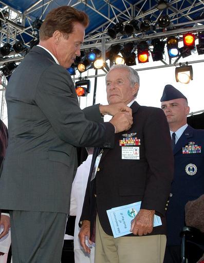 | Keywords: A Schwarzenegger awards at a WWII 60th anniversary ceremony 2005.jpg en San Diego Calif May 29 2005 - California Gov Arnold Schwarzenegger awards a Rupture Duck to Army Air Corps Veteran Harry Kaplan at a WWII 60th anniversary ceremony The Rupture Duck was given to service members honorably discharged from the service during WWII The ceremony was organized by the Department of Defense World War II 60th Anniversary Commemoration Committee to pay tribute and recognize World War II veterans for their outstanding service and sacrifice during the Memorial Day weekend http //www navy mil/view_image asp id 24845 2005-05-29 U S Navy photo by Photographer's Mate 1st Class Michael Moriatis PD-USGov-Military-Navy Arnold Schwarzenegger in 2005 20050529 |