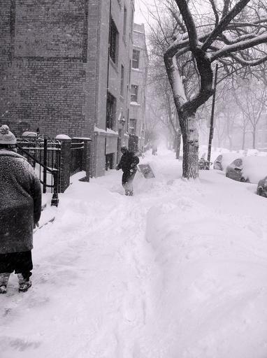 Keywords: sidewalk chicago illinois city winter snow ice buildings cities black and white people man shoveling working clearing urban architecture outside