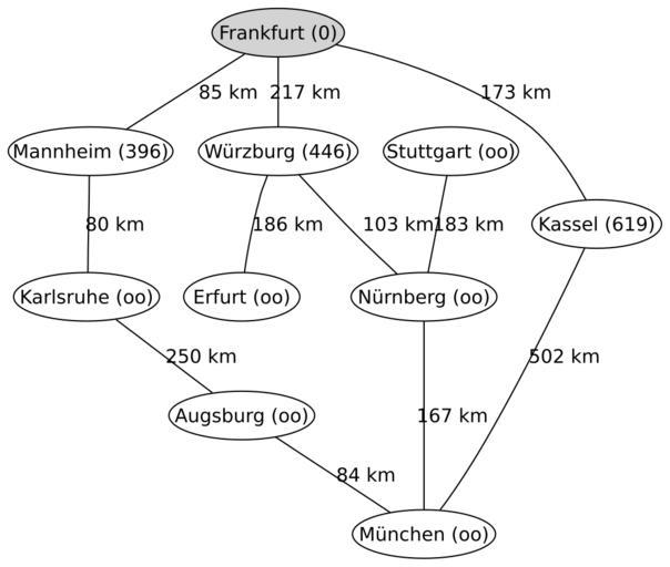 Keywords: A-Star1.svg First Step of a run of the A search Algorithm on a map of Germany Created by de Benutzer Regnaron with graphviz A search algorithm 2005-11-06 own assumed Regnaron~commonswiki