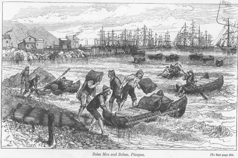 | Keywords: A Visit to Chile 1890 37.png en A Visit to Chile and the Nitrate Fields of Tarapaca 1890 page 235 From the Station I walked to the beach close to the railway where the surf was breaking on the rocks and the bolsa men were loading the lighters with nitrate an operation exceedingly well-managed and very interesting to look at The lighters cannot approach the shore owing t o the surf and they can only lie at the pier when it is very smooth indeed and that very seldom happens on this Pacific coast So the nitrate bags are carried from the wharf by the iioba men off to the lighters which lie outside the line of breakers Practice makes perfect The bolsa is simply a couple of large bladders which are made from the skins of the sea-lions which are dressed and trimmed by the Chilians; along the coast the extremities being closed and sewn up in the form of a 1890 A Visit to Chile and the Nitrate Fields of Tarapaca etc by William Howard Russell Ll D With illustrations of Mr Melton Prior Melton Prior other versions Saltpeter Works of Chile Tarapaca Valparaiso Railroad of Chile PD-old-70-1923 A Visit to Chile and the Nitrate Fields of Tarapaca |