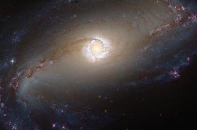 | Keywords: ngc 1097 ngc1097 texture water underwater The NASA/ESA Hubble Space Telescope provides us this week with a spectacular image of the bright star-forming ring that surrounds the heart of the barred spiral galaxy NGC 1097. In this image, the larger-scale structure of the galaxy is barely visible: its comparatively dim spiral arms, which surround its heart in a loose embrace, reach out beyond the edges of this frame. This face-on galaxy, lying 45 million light-years away from Earth in the southern constellation of Fornax (The Furnace), is particularly attractive for astronomers. NGC 1097 is a Seyfert galaxy. Lurking at the very centre of the galaxy, a supermassive black hole 100 million times the mass of our Sun is gradually sucking in the matter around it. The area immediately around the black hole shines powerfully with radiation coming from the material falling in. The distinctive ring around the black hole is bursting with new star formation due to an inflow of material toward the central bar of the galaxy. These star-forming regions are glowing brightly thanks to emission from clouds of ionised hydrogen. The ring is around 5000 light-years across, although the spiral arms of the galaxy extend tens of thousands of light-years beyond it. NGC 1097 is also pretty exciting for supernova hunters. The galaxy experienced three supernovae (the violent deaths of high-mass stars) in the 11-year span between 1992 and 2003. This is definitely a galaxy worth checking on a regular basis. However, what it is really exciting about NGC 1097 is that it is not wandering alone through space. It has two small galaxy companions, which dance “the dance of stars and the dance of space” like the gracious dancer of the famous poem The Dancer by Khalil Gibran. The satellite galaxies are NGC 1097A, an elliptical galaxy orbiting 42 000 light-years from the centre of NGC 1097 and a small dwarf galaxy named NGC 1097B. Both galaxies are located out beyond the frames of this image and they cannot be seen. Astronomers have indications that NGC 1097 and NGC 1097A have interacted in the past. This picture was taken with Hubble’s Advanced Camera for Surveys using visual and infrared filters. A version of this image was submitted to the Hubble’s Hidden Treasures image processing competition by contestant Eedresha Sturdivant. The NASA/ESA Hubble Space Telescope provides us this week with a spectacular image of the bright star-forming ring that surrounds the heart of the barred spiral galaxy NGC 1097. In this image, the larger-scale structure of the galaxy is barely visible: its comparatively dim spiral arms, which surround its heart in a loose embrace, reach out beyond the edges of this frame. This face-on galaxy, lying 45 million light-years away from Earth in the southern constellation of Fornax (The Furnace), is particularly attractive for astronomers. NGC 1097 is a Seyfert galaxy. Lurking at the very centre of the galaxy, a supermassive black hole 100 million times the mass of our Sun is gradually sucking in the matter around it. The area immediately around the black hole shines powerfully with radiation coming from the material falling in. The distinctive ring around the black hole is bursting with new star formation due to an inflow of material toward the central bar of the galaxy. These star-forming regions are glowing brightly thanks to emission from clouds of ionised hydrogen. The ring is around 5000 light-years across, although the spiral arms of the galaxy extend tens of thousands of light-years beyond it. NGC 1097 is also pretty exciting for supernova hunters. The galaxy experienced three supernovae (the violent deaths of high-mass stars) in the 11-year span between 1992 and 2003. This is definitely a galaxy worth checking on a regular basis. However, what it is really exciting about NGC 1097 is that it is not wandering alone through space. It has two small galaxy companions, which dance “the dance of stars and the dance of space” like the gracious dancer of the famous poem The Dancer by Khalil Gibran. The satellite galaxies are NGC 1097A, an elliptical galaxy orbiting 42 000 light-years from the centre of NGC 1097 and a small dwarf galaxy named NGC 1097B. Both galaxies are located out beyond the frames of this image and they cannot be seen. Astronomers have indications that NGC 1097 and NGC 1097A have interacted in the past. This picture was taken with Hubble’s Advanced Camera for Surveys using visual and infrared filters. A version of this image was submitted to the Hubble’s Hidden Treasures image processing competition by contestant Eedresha Sturdivant. |