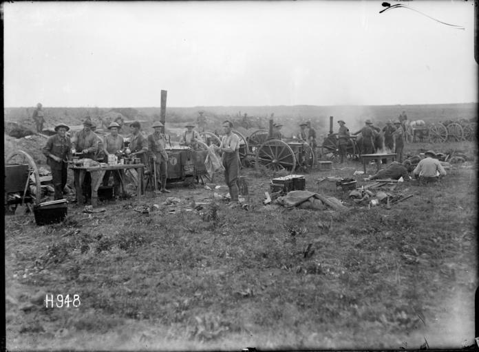| Keywords: blackandwhite monochrome outdoor black and white General view of a Wellington Regiment's field kitchen close to the front line in World War I. Shows a number of field cookers and soldiers working at a table. Photograph taken at Grevillers, France, 24 August 1918 by Henry Armytage Sanders. Inscriptions: Inscribed - Photographer's title on negative -bottom left: H948. Quantity: 1 b&w original negative(s). Physical Description: Dry plate glass negative 4 x 5 inches A Wellington Regiment's field kitchen near the front line, World War I. Royal New Zealand Returned and Services' Association :New Zealand official negatives, World War 1914-1918. Ref: 1/2-013518-G. Alexander Turnbull Library, Wellington, New Zealand. natlib.govt.nz/records/22696605 General view of a Wellington Regiment's field kitchen close to the front line in World War I. Shows a number of field cookers and soldiers working at a table. Photograph taken at Grevillers, France, 24 August 1918 by Henry Armytage Sanders. Inscriptions: Inscribed - Photographer's title on negative -bottom left: H948. Quantity: 1 b&w original negative(s). Physical Description: Dry plate glass negative 4 x 5 inches A Wellington Regiment's field kitchen near the front line, World War I. Royal New Zealand Returned and Services' Association :New Zealand official negatives, World War 1914-1918. Ref: 1/2-013518-G. Alexander Turnbull Library, Wellington, New Zealand. natlib.govt.nz/records/22696605 |