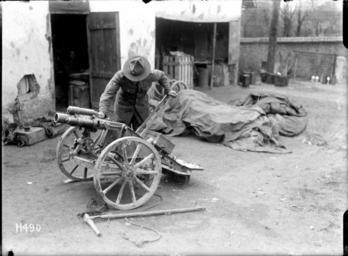| Keywords: blackandwhite monochrome bike vehicle black and white A New Zealand soldier examining a German infantry light field piece captured intact by New Zealanders in World War I. Photograph taken at Bus-en-Artois, France, on 6 April 1918 by Henry Armytage Sanders. Inscriptions: Inscribed - Photographer's title on negative -bottom left: H490. Quantity: 1 b&w original negative(s). Physical Description: Dry plate glass negative 4.75 x 6.5 inches A World War I German infantry field piece, Bus-les-Artois, France. Royal New Zealand Returned and Services' Association :New Zealand official negatives, World War 1914-1918. Ref: 1/2-013106-G. Alexander Turnbull Library, Wellington, New Zealand. natlib.govt.nz/records/22666157 A New Zealand soldier examining a German infantry light field piece captured intact by New Zealanders in World War I. Photograph taken at Bus-en-Artois, France, on 6 April 1918 by Henry Armytage Sanders. Inscriptions: Inscribed - Photographer's title on negative -bottom left: H490. Quantity: 1 b&w original negative(s). Physical Description: Dry plate glass negative 4.75 x 6.5 inches A World War I German infantry field piece, Bus-les-Artois, France. Royal New Zealand Returned and Services' Association :New Zealand official negatives, World War 1914-1918. Ref: 1/2-013106-G. Alexander Turnbull Library, Wellington, New Zealand. natlib.govt.nz/records/22666157 |