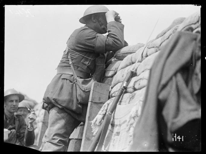 Keywords: blackandwhite monochrome sculpture photo border outdoor black and white A New Zealand Brigade Commander, identified as Brigadier General Harry Townsend Fulton, looks through binoculars at the German position from a front line trench on Hill 63, near Messines, during World War I. Photograph taken May 1917 by Henry Armytage Sanders. Inscriptions: Inscribed - Photographer's title on negative -bottom right: H41. Quantity: 1 b&w original negative(s). Physical Description: Dry plate glass negative 3.25 x 4.25 inches A World War I Brigade Commander looks at the German line near Messines. Royal New Zealand Returned and Services' Association :New Zealand official negatives, World War 1914-1918. Ref: 1/4-009463-G. Alexander Turnbull Library, Wellington, New Zealand. natlib.govt.nz/records/23075680 A New Zealand Brigade Commander, identified as Brigadier General Harry Townsend Fulton, looks through binoculars at the German position from a front line trench on Hill 63, near Messines, during World War I. Photograph taken May 1917 by Henry Armytage Sanders. Inscriptions: Inscribed - Photographer's title on negative -bottom right: H41. Quantity: 1 b&w original negative(s). Physical Description: Dry plate glass negative 3.25 x 4.25 inches A World War I Brigade Commander looks at the German line near Messines. Royal New Zealand Returned and Services' Association :New Zealand official negatives, World War 1914-1918. Ref: 1/4-009463-G. Alexander Turnbull Library, Wellington, New Zealand. natlib.govt.nz/records/23075680 |