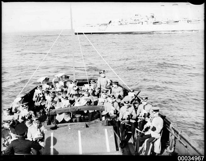 | Keywords: hood collection hoodcollection samuel j hood collection samueljhoodcollection hood royal australian navy royalaustraliannavy navy naval vessel navalvessel sydney hmas australia hmasaustralia flagship hmas canberra hmascanberra abc australian broadcasting commission australianbroadcastingcommission military band militaryband abc military band abcmilitaryband national military band nationalmilitaryband sydney harbour sydneyharbour sydney heads sydneyheads stanley ash stanleyash stan ash stanash blackandwhite monochrome photo border black and white This photograph probably depicts the Australian Broadcasting Commission 22-piece Military Band (also known as the National Military Band) with a conductor performing on board a small vessel with an Australian Broadcasting Commission commentator. A Royal Australian Navy heavy cruiser - either HMAS AUSTRALIA or HMAS CANBERRA - can be seen in the distance. This photo is part of the Australian National Maritime Museum’s Samuel J. Hood Studio collection. Sam Hood (1872-1953) was a Sydney photographer with a passion for ships. His 60-year career spanned the romantic age of sail and two world wars. The photos in the collection were taken mainly in Sydney and Newcastle during the first half of the 20th century. The ANMM undertakes research and accepts public comments that enhance the information we hold about images in our collection. This record has been updated accordingly. Photographer: Samuel J. Hood Studio Collection Object no. 00034967 This photograph probably depicts the Australian Broadcasting Commission 22-piece Military Band (also known as the National Military Band) with a conductor performing on board a small vessel with an Australian Broadcasting Commission commentator. A Royal Australian Navy heavy cruiser - either HMAS AUSTRALIA or HMAS CANBERRA - can be seen in the distance. This photo is part of the Australian National Maritime Museum’s Samuel J. Hood Studio collection. Sam Hood (1872-1953) was a Sydney photographer with a passion for ships. His 60-year career spanned the romantic age of sail and two world wars. The photos in the collection were taken mainly in Sydney and Newcastle during the first half of the 20th century. The ANMM undertakes research and accepts public comments that enhance the information we hold about images in our collection. This record has been updated accordingly. Photographer: Samuel J. Hood Studio Collection Object no. 00034967 |