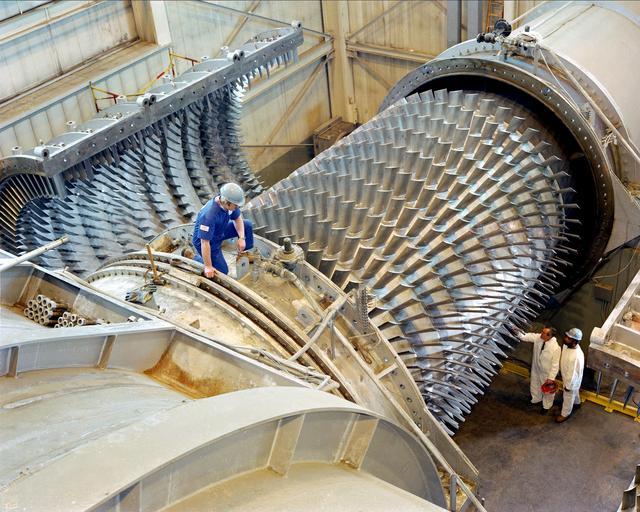 | Keywords: indoor (C-1984-615): Compressor Number 2 illustrates the size of the ASWT’s drive. The compressor’s stator case is open for inspection and maintenance. Compressor Number 1 is similar, though it is driven by four of these motors. Altogether, the seven motors can deliver a total of 290,500 horsepower. (C-1984-615): Compressor Number 2 illustrates the size of the ASWT’s drive. The compressor’s stator case is open for inspection and maintenance. Compressor Number 1 is similar, though it is driven by four of these motors. Altogether, the seven motors can deliver a total of 290,500 horsepower. |