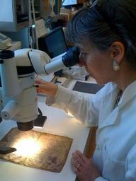 | Keywords: http://thedigitalwalters.org/ httpthedigitalwaltersorg indoor The Walters Art Museum's book conservator looking through a microscope at mold damaged parchment. The Walters Art Museum's book conservator looking through a microscope at mold damaged parchment. |