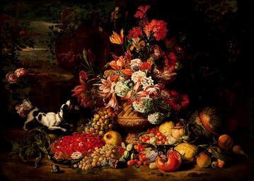 View Original:Abraham_Bruegel_-_Natureza-morta_com_flores,_frutas_e_cachorro,_1677.jpg (800x571)