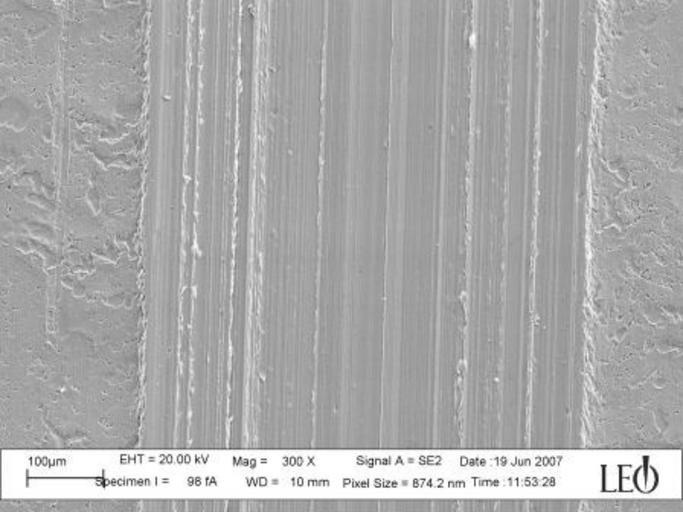 | Keywords: Abrassiv Web.jpg  A picture on sheet damage created by the galling phenomenon using a SOFS TNO test equipment The characteristic pattern illustrate continues lines or stripes indicating a breakthrough of the oxide surface layer Abrasive wear is distinguished by damage below the sheets surface layer and consequently is the pattern discussed as an abrasive pattern due to these formed continues stripes Own 2007-06-06 Harald Wallin Haraldwallin PermissionOTRS 2009111310051115 http //www diva-portal org/smash/record jsf searchId 1 pid diva2 37573 This picture at diva-portal org Welding testing and qualification Tribology |