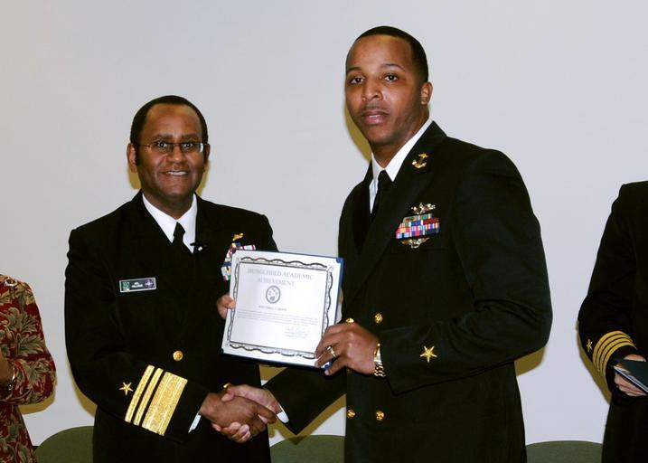 Keywords: Academic award 090209-N-YT478-044.jpg en Officer Candidate Tyrell Grant receives the Distinguished Academic Award from Vice Adm Mel Williams Jr commander of U S 2nd Fleet during an awards ceremony in celebration of Black History Month Grant formerly an active-duty Electronics Technician 1st Class received the award for having a grade point average of 3 81 for the Fall 2008 semester U S Navy photo by Mass Communication Specialist 1st Class Lolita M Lewis/Released 2009-02-09 Petty Officer 1st Class Lolita Lewis https //www dvidshub net/image/1269709 090209-N-YT478-044 2014-04-24 08 05 NORFOLK VA US PD-USGov-Military-Navy Black History Month Images from DoD uploaded by Fæ