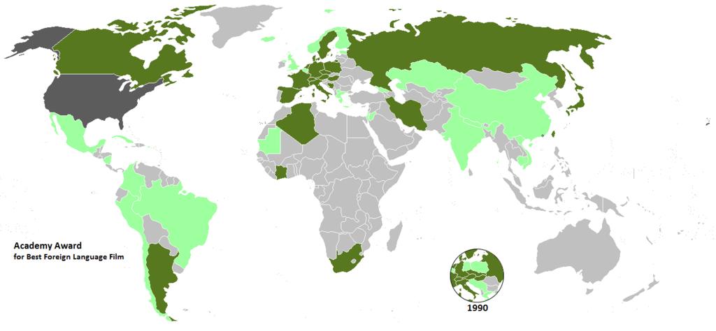 | Keywords: Academy Award for Best Foreign Language Film.PNG 57781F Won the award 1px 555 solid 9DFF9D Nominated for the award 1px 555 solid 5C5C5C United States ineligible for competition 1px 555 solid This map based on a blank map from Wikipedia shows countries that have been nominated for and/or won the Academy Award for Best Foreign Language Film or one of its Special/Honorary predecessors Countries in dark green have received the award at least once Countries in light green have been nominated for the award but have not managed to win it so far The United States home base of the Academy of Motion Picture Arts and Sciences which hands out the award each year is pictured in dark grey American films are ineligible for competition in the Foreign Language Film category en wikipedia ; Transfer was stated to be made by BomBom 2007-12-03 BomBom wikipedia en Academy Award for Best Foreign Language Film svg BomBom original upload log page en wikipedia Academy_Award_for_Best_Foreign_Language_Film PNG 2008-02-25 04 55 Worabi 1357×628×8 57097 bytes Highlighted Austria in dark green 2008-02-12 14 47 BomBom 1357×628×8 57095 bytes Put the US in dark grey 2008-02-11 15 03 BomBom 1357×628×8 57032 bytes nicer shade of green 2008-02-11 14 52 BomBom 1357×628×8 57049 bytes remade map using better-looking colours 2008-01-22 15 10 BomBom 1357×628×8 57067 bytes This map based on a blank map from Wikipedia shows countries that have been nominated for and/or won the Academy Award for Best Foreign Language Film which is handed out annually by the Academy of Motion Picture Arts and Sciences AMPAS Countries 2007-12-03 16 00 BomBom 1357×628×8 57087 bytes This map based on a blank map from Wikipedia shows countries that have been nominated for and/or won the Academy Award for Best Foreign Language Film which is handed out annually by the Academy of Motion Pictur Academy Awards |