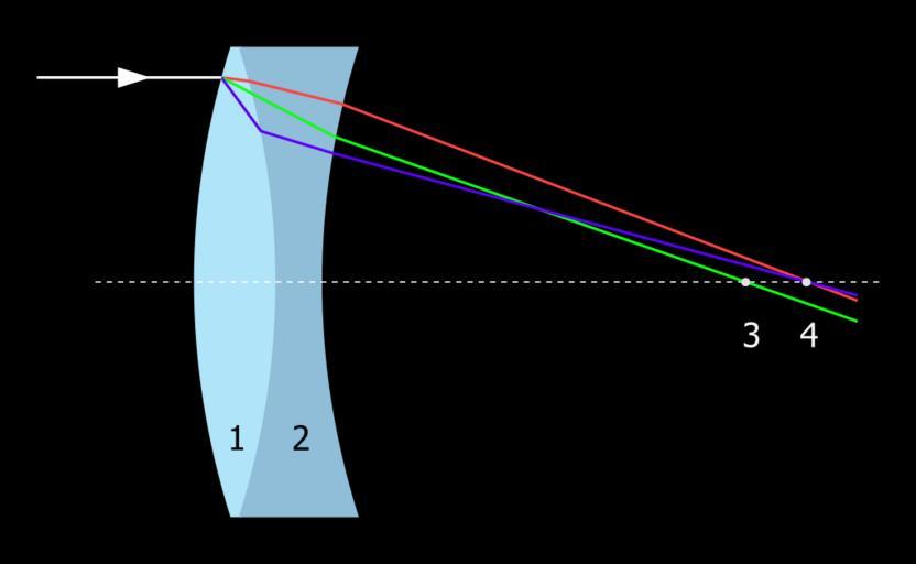 | Keywords: Achromat 2.svg Achromat; 1 - crown glass 2 - flint glass 3 - focal point for green light; 4 - common focal point for red and blue light Note refraction angles are axaggerated and may not reflect true run of light beam s English Polish Chromatic aberration diagrams Flint glass |