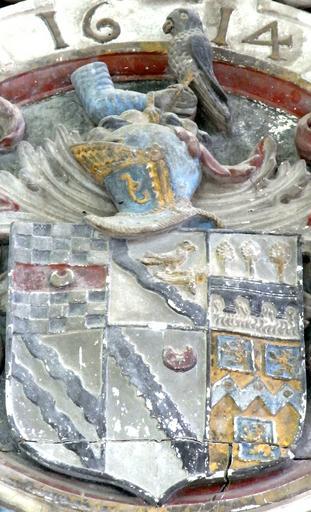 | Keywords: AclandAchievementBroadclyst.JPG Heraldic achievement of Sir John Acland d 1620 detail from his monument in Broadclyst Church Devon; Escutcheon quarterly of 6 1st Acland with a crescent or for difference of a 2nd son; 2nd Argent above a bend wavy sable a man's hand couped at the wrist in a glove lying fessways thereon a falcon perched all or; 3rd 4th Argent two bendlets wavy sable Stapledon of Annery 5th Argent a bend engrailled sable Radcliffe ; 6th Or on a fesse dancetté between three billets azure each charged with a lion rampant of the first three bezants Rolle Crest above a man's hand couped at the wrist in a glove lying fessways thereon a falcon perched all proper Acland own photo 1613; photo 2013 Lobsterthermidor <span class signature-talk >talk</span> 18 42 14 September 2013 UTC St John the Baptist Church Broadclyst Heraldic memorials in the United Kingdom Reliefs of coats of arms in England Acland arms Stapledon arms Radcliffe arms Rolle arms |
