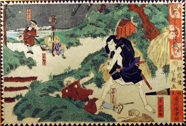 | Keywords: Act V, The Robber Sadakuro Ambushes Yoichbei, and Yagoro and Kanpei Meet (5765903332).jpg en <b>Accession Number </b> 2008 85 <b>Display Artist </b> Utagawa Yoshiiku <b>Display Title </b> Act V The Robber Sadakuro Ambushes Yoichbei and Yagoro and Kanpei Meet <b>Series Title </b> Japanese Syllabary Copybook on The Treasury of Loya Retainers <b>Suite Name </b> Kanadehon Chushingura <b>Creation Date </b> 1862 <b>Medium </b> Woodblock <b>Height </b> 9 1/4 in <b>Width </b> 13 1/2 in <b>Display Dimensions </b> 9 1/4 in x 13 1/2 in 23 5 cm x 34 29 cm <b>Publisher </b> Hirookaya Kosuke <b>Credit Line </b> Gift of Captain George B Powell Jr JAGC USN <b>Label Copy </b> In the foreground of this print the villainous robber Sadakur attacks an old man named Yochibei whom he will stab to death in order to steal the large sum of money he was carrying Yochibei was the father-in-law of Kanpei who had been one of the samurai retainers of Lord Enya Kanpei had failed to prevent his master from committing the attack that led to his death so he was shamed into retiring to the life of a hunter In the background Kanpei the hunter meets by chance another one of Lord Enyas samurai retainers Yagor who tells Kanpei that he can buy his way back into the honorable samurai fellowship Hearing this Kanpeis father-in-law Yochibei secretly sells his daughter Kanpeis beloved wife Okaru into prostitution While returning home with the money Yochibei is murdered and robbed as seen in the foreground <b>Collection </b> http //www sdmart org/art/our-collection/asian-art The San Diego Museum of Art 2008-05-13 09 31 37 https //www flickr com/photos/thesandiegomuseumofartcollection/5765903332/ Flickr en thesandiegomuseumofartcollection PD-old-100 Art of Japan in the San Diego Museum of Art |