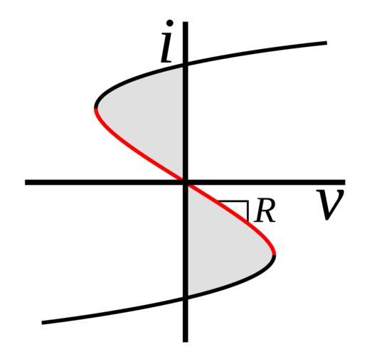 | Keywords: Active negative resistance - current controlled.svg Current-voltage IV diagram of a linear negative resistance produced at the port of an amplifier with positive feedback The curve has a straight line segment through the origin with negative slope -R so applying a voltage v to the amplifier causes a proportional current i to flow out of the positive terminal the opposite of an ordinary positive resistance The device has both negative differential resistance grey region and negative static resistance <font color red >red</font> region <br /> <math>R v \over i \Delta v \over \Delta i < 0 \ </math> Applying a large enough current of either polarity to it moves the amplifier into nonlinear regions of the curve saturating the amplifier so the resistance becomes positive black portion of curve This type of negative resistance is found in feedback oscillators negative impedance converters and active filters own Chetvorno 2013-07-22 Negative resistance Device current-voltage characteristics Cc-zero |