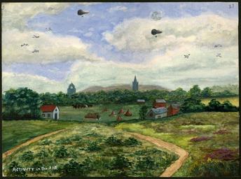 | Keywords: university of victoria universityofvictoria uvic great britain. army. royal regiment of artillery greatbritainarmyroyalregimentofartillery caricatures and cartoons--20th century caricaturesandcartoons20thcentury notebooks war artists warartists world war, 1914-1918--pictorial works worldwar19141918pictorialworks world war, 1914-1918--caricatures and cartoons worldwar19141918caricaturesandcartoons outdoor landscape grass field plant grassland Item is one of 123 pen-and-ink drawings and watercolours from two volumes titled: "Sketches of the War: France/Belgium". The sketches vary from satirical cartoons to more detailed and naturalistic renditions. They are often accompanied by an ironic title and are often signed with the artist's initials, "J.M." The artist's satirical targets include the officers and high command of both combatant sides; the disjuncture between reported and actual events, and the death of civilians as a fact of modern warfare. Item is one of 123 pen-and-ink drawings and watercolours from two volumes titled: "Sketches of the War: France/Belgium". The sketches vary from satirical cartoons to more detailed and naturalistic renditions. They are often accompanied by an ironic title and are often signed with the artist's initials, "J.M." The artist's satirical targets include the officers and high command of both combatant sides; the disjuncture between reported and actual events, and the death of civilians as a fact of modern warfare.  |
