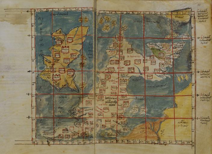 | Keywords: Add 19391 19-20.png Greek-language map of Hibernia Ireland and Albion Great Britain derived from Ptolemy's Geography probably in the early 14th century at Constantinople Istanbul held by the Vatopedi Monastery on Mount Athos prior to its theft and purchase by the British Museum The map reflects Ptolemy's mistaken placement of Scotland at a right angle to the rest of Britain apparently derived from his reliance on seafarer's logs early 14th century Codex Athous Vatopedinus 655 http //www bl uk/manuscripts/FullDisplay aspx ref Add_MS_19391 Add British Museum Additional MS 19391 f19v-20 British Library London <br>A collection of geographical works copied from the Urbinas Graecus 82 in the early 14th century <br>This map stolen by Constantine Simonides and sold to Frederic Madden Keeper of Manuscripts at the British Museum in 1853 Anonymous likely a monk or scholar of Constantinople sometimes associated with Maximus Planudes <br>Based upon the Geography of Claudius Ptolemy PD-Art PD-old-100 other versions <gallery> File Ptolemaic Britain jpg A low-resolution false-color version File Ptolemy-british-isles edited jpg A Latin version from a 1490 MS File Prima Europe tabula jpg 14th Century Printed version High Quality </gallery> ImageNote 1 1231 1146 166 35 2512 1828 2 Ἀλȣϊωɴοϲ<br> Alouïōnos<br> Alouion Albion GreatBritain ImageNoteEnd 1 ImageNote 2 1243 1203 148 63 2512 1828 2 ϲϐᴩᴇᴛᴛ ϊᴋ <br>Nēs Bretta Mïkē <br>IslandofGreatBritain ImageNoteEnd 2 ImageNote 3 1036 490 82 223 2512 1828 2 Ἰȣέρνϊοϲώκεανὸϲ<br>IouérnïosṒkeanòs<br>TheHibernianOcean TheIrishSea ImageNoteEnd 3 ImageNote 4 2066 182 122 41 2512 1828 2 Θȣλ ν σ°<br>Thoulēnēsos<br>ThuleIsland ImageNoteEnd 4 ImageNote 5 1313 1483 57 50 2512 1828 2 λωνδϊνϊον<br>Lōndïnïon<br>Londinium London ImageNoteEnd 5 ImageNote 6 1221 1285 69 47 2512 1828 2 λϊνδον<br>Lïndon<br>LindumColonia Lincoln ImageNoteEnd 6 ImageNote 7 1743 1008 229 38 2512 1828 2 ώκεαν°Γερμανικ°<br>ṒkeanòsGermanikòs<br>TheGermanicOcean TheNorthSea ImageNoteEnd 7 ImageNote 8 1645 1495 148 116 2512 1828 2 BelgicGaul ImageNoteEnd 8 ImageNote 9 1790 569 119 41 2512 1828 2 CaledonianForest ImageNoteEnd 9 ImageNote 10 615 895 104 60 2512 1828 2 ῒȣερνϊσ<br>Iouernïs<br>Hibernia ImageNoteEnd 10 ImageNote 11 1422 1112 88 66 2512 1828 2 Εβόρακον<br>Ebórakon<br>Eboracum York ImageNoteEnd 11 ImageNote 12 374 1542 47 35 2512 1828 2 νᴦ<br>LIII<br>53 ImageNoteEnd 12 ImageNote 13 374 1677 44 31 2512 1828 2 νβ<br>LII<br>52 ImageNoteEnd 13 ImageNote 14 374 1407 44 35 2512 1828 2 νδ<br>LIIII<br>54 ImageNoteEnd 14 ImageNote 15 374 1272 41 25 2512 1828 2 νϵ<br>LV<br>55 ImageNoteEnd 15 ImageNote 16 374 1128 50 28 2512 1828 2 νϛ<br>LVI<br>56 ImageNoteEnd 16 ImageNote 17 374 983 41 38 2512 1828 2 νζ<br>LVII<br>57 ImageNoteEnd 17 ImageNote 18 374 848 41 38 2512 1828 2 ν <br>LVIII<br>58 ImageNoteEnd 18 ImageNote 19 374 707 44 38 2512 1828 2 νθ<br> LVIIII<br> 59 ImageNoteEnd 19 ImageNote 20 374 572 28 35 2512 1828 2 ξ<br>LX<br>60 ImageNoteEnd 20 ImageNote 21 374 430 31 28 2512 1828 2 ξα<br>LXI<br>61 ImageNoteEnd 21 ImageNote 22 371 292 38 28 2512 1828 2 ξβ<br>LXII<br>62 ImageNoteEnd 22 ImageNote 23 364 141 44 41 2512 1828 2 ξᴦ<br>LXIII<br>63 ImageNoteEnd 23 ImageNote 24 430 1674 38 38 2512 1828 2 ζ<br>VI<br>6 ImageNoteEnd 24 ImageNote 25 502 1680 28 28 2512 1828 2 <br>VIII<br>8 ImageNoteEnd 25 ImageNote 26 568 1677 38 31 2512 1828 2 θ<br>VIIII<br>9 ImageNoteEnd 26 ImageNote 27 634 1674 44 41 2512 1828 2 ι<br>X<br>10 ImageNoteEnd 27 ImageNote 28 707 1677 38 38 2512 1828 2 ια<br>XI<br>11 ImageNoteEnd 28 ImageNote 29 785 1680 38 35 2512 1828 2 ιβ<br>XII<br>12 ImageNoteEnd 29 ImageNote 30 851 1674 41 41 2512 1828 2 ιᴦ<br>XIII<br>13 ImageNoteEnd 30 ImageNote 31 923 1677 38 38 2512 1828 2 ιδ<br>XIIII<br>14 ImageNoteEnd 31 ImageNote 32 995 1671 35 41 2512 1828 2 ιϵ<br>XV<br>15 ImageNoteEnd 32 ImageNote 33 1061 1668 41 41 2512 1828 2 ιϛ<br>XVI<br>16 ImageNoteEnd 33 ImageNote 34 1171 1662 41 44 2512 1828 2 ιζ<br>XVII<br>17 ImageNoteEnd 34 ImageNote 35 1240 1662 44 38 2512 1828 2 ι <br>XVIII<br>18 ImageNoteEnd 35 ImageNote 36 1309 1662 44 38 2512 1828 2 ιθ<br>XVIIII<br>19 ImageNoteEnd 36 ImageNote 37 1375 1658 38 41 2512 1828 2 κ<br>XX<br>20 ImageNoteEnd 37 ImageNote 38 1441 1662 41 41 2512 1828 2 κα<br>XXI<br>21 ImageNoteEnd 38 ImageNote 39 1510 1662 44 41 2512 1828 2 κβ<br>XXII<br>22 ImageNoteEnd 39 ImageNote 40 1579 1662 38 41 2512 1828 2 κᴦ<br>XXIII<br>23 ImageNoteEnd 40 ImageNote 41 1652 1658 47 44 2512 1828 2 κδ<br>XXIIII<br>24 ImageNoteEnd 41 ImageNote 42 1730 1662 41 41 2512 1828 2 κϵ<br>XXV<br>25 ImageNoteEnd 42 ImageNote 43 1799 1665 41 41 2512 1828 2 κϛ<br>XXVI<br>26 ImageNoteEnd 43 ImageNote 44 1871 1668 38 38 2512 1828 2 κζ<br>XXVII<br>27 ImageNoteEnd 44 ImageNote 45 1941 1665 38 44 2512 1828 2 κ <br>XXVIII<br>28 ImageNoteEnd 45 ImageNote 46 2217 1674 38 41 2512 1828 2 λβ<br>XXXII<br>32 ImageNoteEnd 46 ImageNote 47 2148 1674 41 35 2512 1828 2 λα<br>XXXI<br>31 ImageNoteEnd 47 ImageNote 48 2270 1677 44 35 2512 1828 2 λᴦ<br>XXXIII<br>33 ImageNoteEnd 48 ImageNote 49 2006 1671 41 38 2512 1828 2 κθ<br>XXVIIII<br>29 ImageNoteEnd 49 ImageNote 50 2082 1671 35 41 2512 1828 2 λ<br>XXX<br>30 ImageNoteEnd 50 ImageNote 51 2333 35 50 47 2512 1828 2 20 ImageNoteEnd 51 British Isles and Ireland Maps of Roman Britain Maps of the history of the United Kingdom Historical maps of Wales Old maps of Scotland Historical maps of Ireland Maps of the history of England Maps of the history of Wales Maps of the history of Scotland Maps of the history of Ireland Ptolemy |
