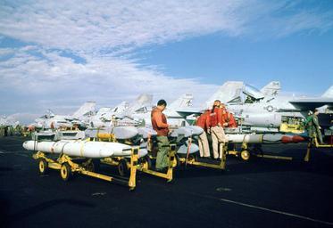 | Keywords: ADM-141 TALD aboard USS Kennedy.jpg An aviation ordnanceman inspects an ADM-141 Tactical air-launched decoy as his companions work with AGM-88A HARM high-speed anti-radiation missiles on the flight deck of the USS JOHN F KENNEDY CV-67 Planes aboard the Kennedy are being fitted for strikes on Iraqi targets at the onset of Operation Desert Storm Shot 16 Jan 1991 PD-USGov-Military-Navy ADM-141 TALD AGM-88 HARM United States Navy in the Gulf War 1990-1991 | ||||