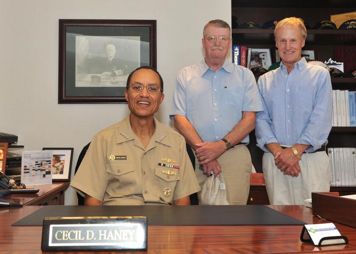 | Keywords: Adm. Chester Nimitz's grandsons at Pearl Harbor 130830-N-IT566-058.jpg en Adm Cecil D Haney commander of U S Pacific Fleet Richard Lay and Chester Nimitz Lay grandsons of fleet Adm Chester Nimitz pose for a photo inside Haney's office on the fleet headquarters compound where their grandfather worked and lived The Lays are in Hawaii for a ceremony to commemorate the 68th anniversary of end of World War II Sept 2 aboard the Battleship Missouri Memorial where a bronze statue of Adm Nimitz will also be unveiled Nimitz served as the commander in chief for U S Pacific Fleet from Dec 31 1941 to Nov 24 1945 U S Navy Photo by Mass Communication Specialist 2nd Class David Kolmel 2013-08-30 Petty Officer 2nd Class David Kolmel https //www dvidshub net/image/1008015 130830-N-IT566-058 2013-08-30 23 43 PEARL HARBOR HI US PD-USGov-Military-Navy Battleship Missouri Memorial Images from DoD uploaded by Fæ |
