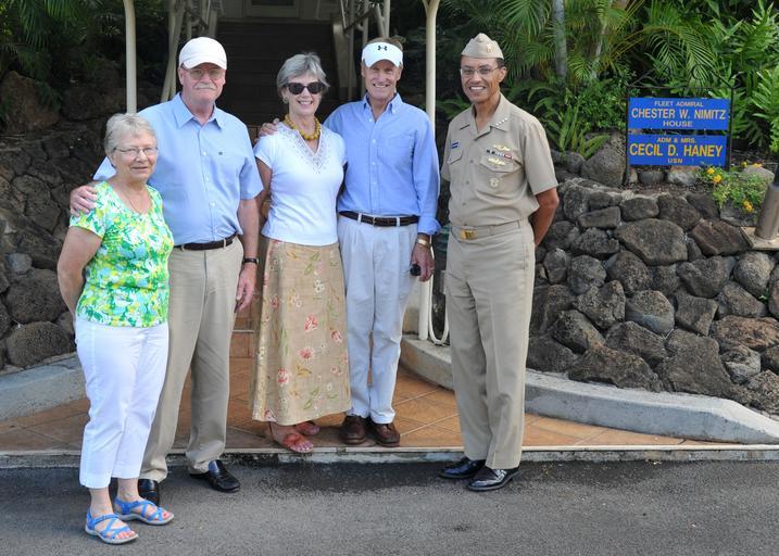 | Keywords: Adm. Chester Nimitz's grandsons at Pearl Harbor 130830-N-IT566-073.jpg en Jean and Richard lay Marion and Chester Nimitz Lay grandsons of fleet Adm Chester Nimitz pose with for a photo with Adm Cecil D Haney commander of U S Pacific Fleet before going a on a tour of Nimitz's house during World War II the fleet headquarters compound where their grandfather worked and lived The Lays are in Hawaii for a ceremony to commemorate the 68th anniversary of end of World War II Sept 2 aboard the Battleship Missouri Memorial where a bronze statue of Adm Nimitz will also be unveiled Nimitz served as the commander in chief for U S Pacific Fleet from Dec 31 1941 to Nov 24 1945 U S Navy Photo by Mass Communication Specialist 2nd Class David Kolmel 2013-08-30 Petty Officer 2nd Class David Kolmel https //www dvidshub net/image/1008017 130830-N-IT566-073 2013-08-30 23 43 PEARL HARBOR HI US PD-USGov-Military-Navy Battleship Missouri Memorial Images from DoD uploaded by Fæ |