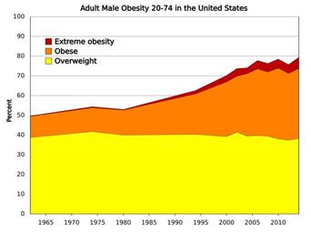 | Keywords: Adult male obesity in the United States.svg translate yes en Percent overweight in the United States of males including obese and extremely obese from 1962 to 2014 A relatively constant 40 declining slightly are overweight but the percent of normal weight has declined while obesity and extreme obesity have increased Data from http //www cdc gov/nchs/data/hestat/obesity_adult_13_14/obesity_adult_13_14 htm CDC 2016-07-22 own Delphi234 other versions cc-zero Obesity statistics for the United States |