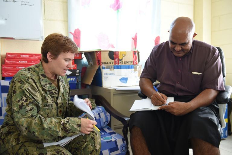| Keywords: Advanced Team gears up For Pacific Partnership 2015 150525-N-HY254-027.jpg en 150525-N-HY254-027 TARAWA Kiribati May 25 2015 Lead Medical Planner Lt Cmdr Tammy Servies from Hammond Indiana and currently assigned to the Navy Environmental and Preventive Medicine Unit 6 NEPMU-6 coordinates schedules with Dr Alani Tangitau the intern coordinator at the Tungaru Central Hospital in Tarawa in preparation for a series of subject matter expert exchanges between medical professionals that will be held during Pacific Partnership 2015 Now in its tenth iteration Pacific Partnership is the largest annual multilateral humanitarian assistance and disaster relief preparedness mission conducted in the Indo-Asia-Pacific region While training for crisis conditions Pacific Partnership missions have provided medical care to approximately 270 000 patients and veterinary services to more than 38 000 animals Additionally PP15 has provided critical infrastructure development to host nations through the completion of more than 180 engineering projects U S Navy photo by Chief Mass Communication Specialist Jonathan R Kulp/Released 2015-05-25 Chief Petty Officer Jonathan Kulp https //www dvidshub net/image/1955646 150525-N-HY254-027 2015-05-26 13 21 TARAWA KI PD-USGov-Military-Navy Pacific Partnership 2015 Images from DoD uploaded by Fæ |