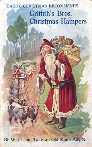 Keywords: christmas australia vintage postcard 1908 brisbane griffiths bros griffithsbros tea santa bullock team bullockteam hamper advertising drawing Christmas advertising postcard for Griffith's Brothers in Queen Street, Brisbane - 1908. They sold tea pots, tea caddies, confectionary and chocolates etc. Here is a newspaper advertisement for their Christmas selection in 1922: trove.nla.gov.au/ndp/del/article/177124323?searchTerm=gri... Christmas advertising postcard for Griffith's Brothers in Queen Street, Brisbane - 1908. They sold tea pots, tea caddies, confectionary and chocolates etc. Here is a newspaper advertisement for their Christmas selection in 1922: trove.nla.gov.au/ndp/del/article/177124323?searchTerm=gri... |
