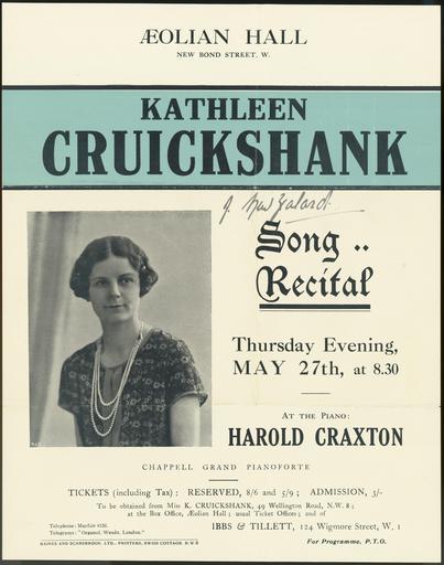 | Keywords: text sign A flier advertising a recital by Kathleen Cruickshank, whose photographic portrait appears at the left. The verso shows the programme which includes songs by Reimann, Schumann, Schubert, Wolf, Keel, Parry, Stanford, Bantock, Bliss. Dated according to perpetual calendar. Kathleen Cruickshank was in England from about 1921 to 1927. Quantity: 1 colour photo-mechanical print(s) on flier. Physical Description: Offset print on flier, 252 x 198 mm. Baines & Scarsbrook Ltd. Aeolian Hall (New Bond Street, W). Kathleen Cruickshank [of New Zealand]. Song recital, Thursday evening, May 27th, at 8.30. At the piano, Harold Craxton. Baines and Scarsbrook Ltd., printers, Swiss Cottage, N.W.6. [1926]. [Theatre programmes for concerts, recitals and music events in Great Britain some featuring New Zealand performers and producers. 1900-1959]. Ref: Eph-B-MUSIC-GB-1926-01. Alexander Turnbull Library, Wellington, New Zealand. natlib.govt.nz/records/22759812 A flier advertising a recital by Kathleen Cruickshank, whose photographic portrait appears at the left. The verso shows the programme which includes songs by Reimann, Schumann, Schubert, Wolf, Keel, Parry, Stanford, Bantock, Bliss. Dated according to perpetual calendar. Kathleen Cruickshank was in England from about 1921 to 1927. Quantity: 1 colour photo-mechanical print(s) on flier. Physical Description: Offset print on flier, 252 x 198 mm. Baines & Scarsbrook Ltd. Aeolian Hall (New Bond Street, W). Kathleen Cruickshank [of New Zealand]. Song recital, Thursday evening, May 27th, at 8.30. At the piano, Harold Craxton. Baines and Scarsbrook Ltd., printers, Swiss Cottage, N.W.6. [1926]. [Theatre programmes for concerts, recitals and music events in Great Britain some featuring New Zealand performers and producers. 1900-1959]. Ref: Eph-B-MUSIC-GB-1926-01. Alexander Turnbull Library, Wellington, New Zealand. natlib.govt.nz/records/22759812 |