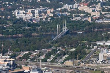 | Keywords: outdoor Green Bridge (officially Eleanor Schonell Bridge) crossing Brisbane River. Portion of University of Queensland campus visible on far side of bridge, portion of Dutton Park visible on near side, with railway track along bottom. CC0 waiver: To the extent possible under law, I waive all copyright and related or neighboring rights to this work. Green Bridge (officially Eleanor Schonell Bridge) crossing Brisbane River. Portion of University of Queensland campus visible on far side of bridge, portion of Dutton Park visible on near side, with railway track along bottom. CC0 waiver: To the extent possible under law, I waive all copyright and related or neighboring rights to this work. |