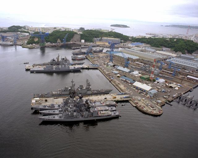 | Keywords: Aerial view of U.S. Naval Base Yokosuka, -26 May 1994 a.jpg U S Naval Base Yokosuka The ships tied up at the piers are b to t the Japan Maritime Self-Defense Force destroyers SAWAGIRI DD-157 ASAGIRI DD-151 the helicopter carrying destroyer KURAMA DDH-144 the destroyer USS O'BRIEN DD-975 the Japanese guided missile destroyer KONGO DDG-173 and a Ticonderoga class guided missile cruiser At the top off to the right is the amphibious command ship USS BLUE RIDGE LCC-19 To the far right at Berth 5 is four Japanese Yushio class submarines DN-SC-95-00737 Navy http //www defenseimagery mil/imagery html guid 73523689292327e0f6e739c94be46607150bc2db 1994-05-26 PH1 H Johnson U S Navy PD-USGov-Military-Navy JS Sawagiri DD-157 JS Asagiri DD-151 JS Kurama DDH-144 USS O'Brien DD-975 JS KongÅ DDG-173 General views of USS Blue Ridge LCC-19 United States Fleet Activities Yokosuka Aerial photographs of Yokosuka |