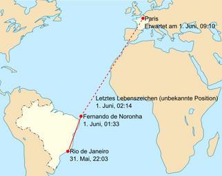 Keywords: AF 447 path-de.svg Air-France-Flug 447 Die rote durchgehende Linie zeigt die bereits geflogende Route die gestrichelte den geplanten Flug nach dem Verschwinden vom Radar en Flight path of Air France Flight 447 on 31 May/1 June The solid red line shows actual route the dashed line is the planned route after the last radar contact fr Trajet du vol Air France 447 qui s'est déroulé durant la nuit du 31 mai/1er juin La ligne rouge continue montre le trajet effectivement effectué et la ligne pontillé le reste du plan de vol après le dernier contact radar Air France - Voo 447 - feito na madrugada de 31 de maio para 1 de junho A linha vermelha contínua mostra a rota que o avião deveria seguir e a linha tracejada é a rota prevista para depois do ponto onde o radar perdeu contato com o avião file AF 447 path-en svg Original Mysid German version kaʁstn 2009-06-02 German version 2009-06-05 File Air France Flight 447 path svg Other fields A 5 + ~ TUBS Maps AF447 2009-05-31 overnight 2009-06-01 flight paths