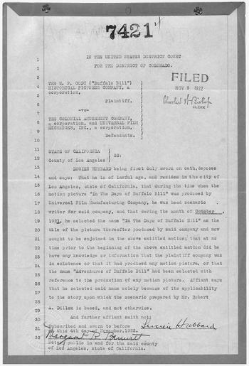 Keywords: Affidavit of Lucien Hubbard - NARA - 292764.tif Scope and content Hubbard a screenwriter from Los Angeles testifies that he created the title for the film In the Days of Buffalo Bill General notes 292764 Local identifier U S District Court for the District of Colorado 1876 - NARA's Rocky Mountain Region Denver NRGA Building 48 Denver Federal Center West 6th Avenue and Kipling Street Denver CO 80225-0307 1922-11-04 Record group Record Group 21 Records of District Courts of the United States 1685 - 2004 Record group ARC 350 U S District Court District of Colorado Civil Case Files compiled 1912 - 1947 Series ARC 292734 File unit The W J Cody 'Buffalo Bill' Historical Pictures Co vs The Colonial Amusement Co et al 09/08/1913 - 10/19/1922 File unit ARC 292735 Variant control numbers NAIL Control Number NRG-21-E27-7421-HUBBARD yes Other versions NARA-cooperation PD-USGov Copyright law of the United States In the Days of Buffalo Bill Courts of the United States Documents in English Affidavits |